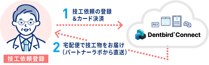 本サービスでは、依頼したいパートナーラボの指定はもちろん、Dentbird Connectのスタッフによるアサイン(割り当て)サービスがご利用いただけます。